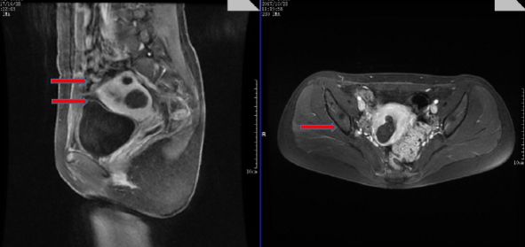 以下是劉女士術(shù)后的核磁影像(箭頭所指即為已經(jīng)缺血壞死的肌瘤)